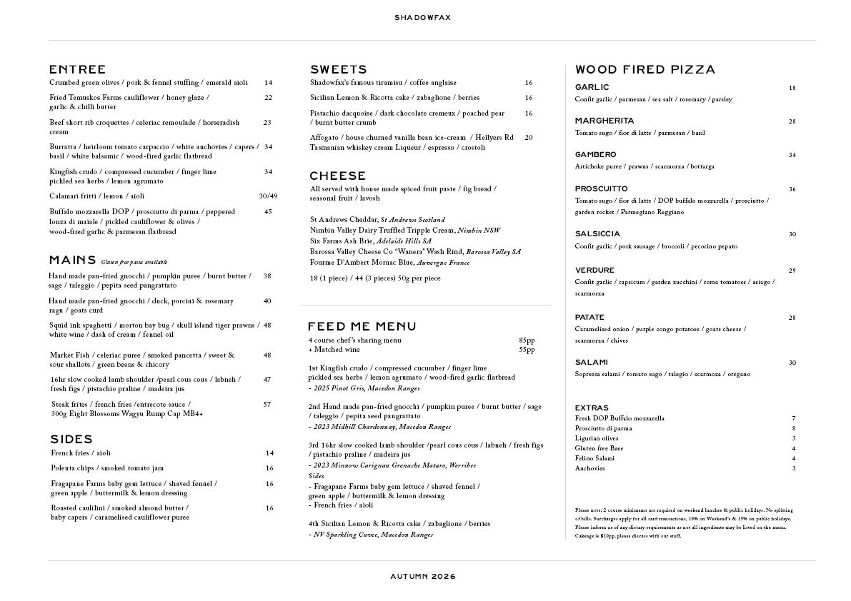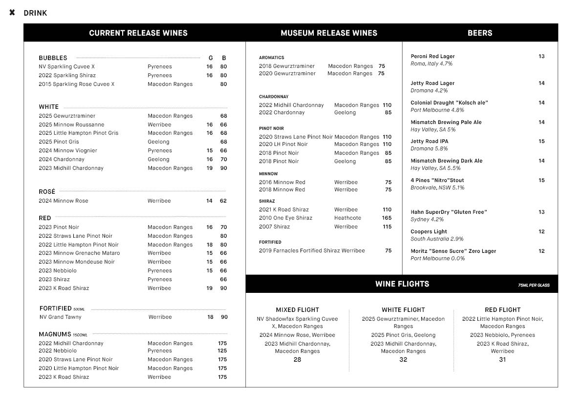 The drinks list showcases Shadowfax’s current releases and museum wines from the cellar, as well as a selection of premium craft beers and spirits from local Victorian breweries and distillers. For the non-drinkers, there's a wide range of non-alcohol options and soft drinks.